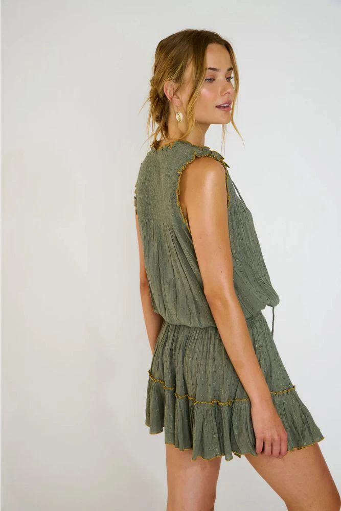 Abito a tunica smanicato con cuciture dorate ed elastico in vita, gonna a balze.