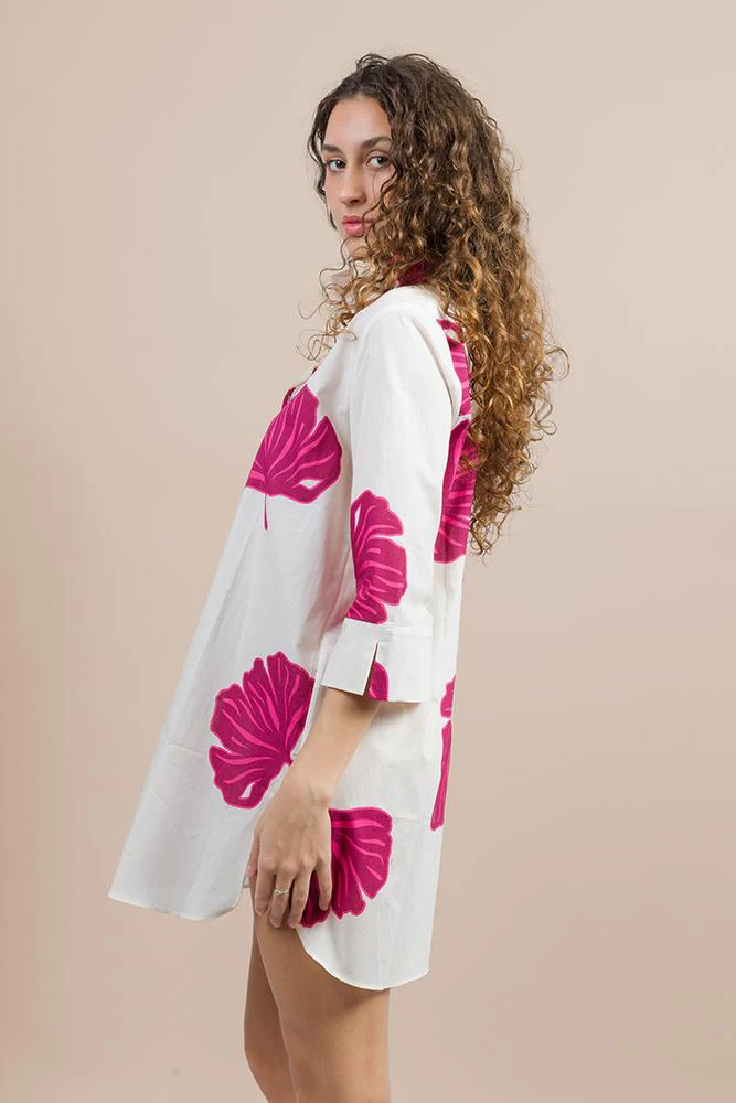 Abito in fantasia elegante, dal taglio ampio e scollo a camicia e chiusura a bottoni, con dettagli floreale, Maniche a tre quarti. Realizzato in morbido cotone per una piacevole sensazione sulla pelle,