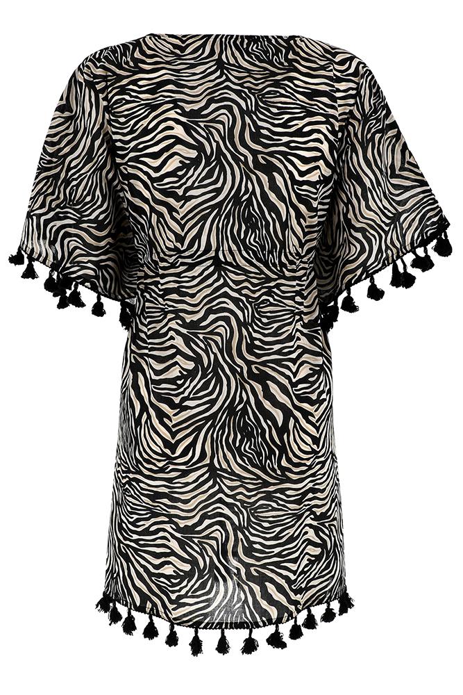 Poncho in cotone stampato con scollo a V decorato con perline e maniche a pipistrello ed orli con nappine.