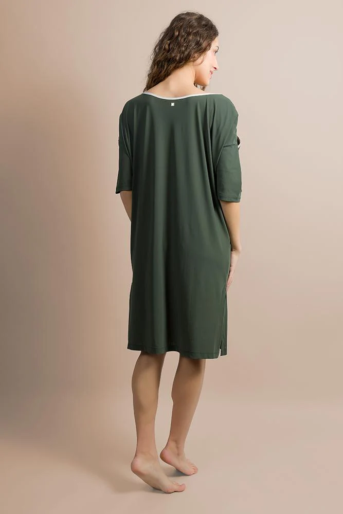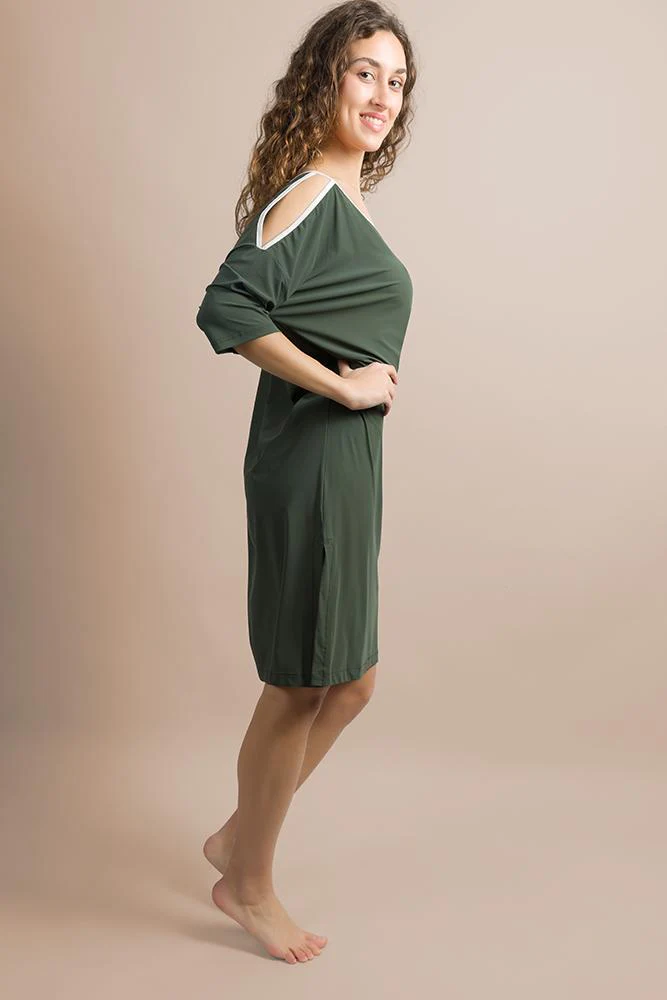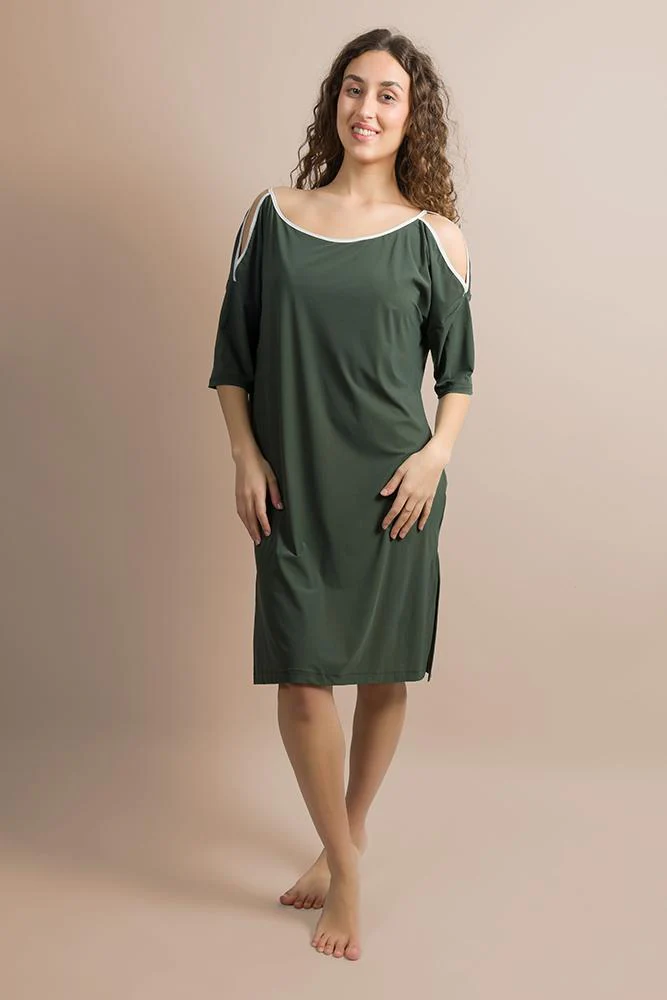 Abito in leggera Viscosa con scollo a U bordato con taglio sulle spalle, dona movimento e leggerezza alla figura. Maniche corte e tasche laterali con taglio obliquo.