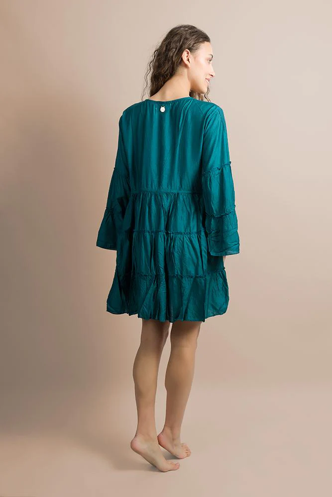 Linea di pregiati capi dallo stile Bohemien ideali da indossare nelle serate estive delle più trandy isole Europee sino ai festival più cool come l’iconico Coachella! Abito a mezza manica ampio con dettaglio di coulisse sulla vita da regolare.