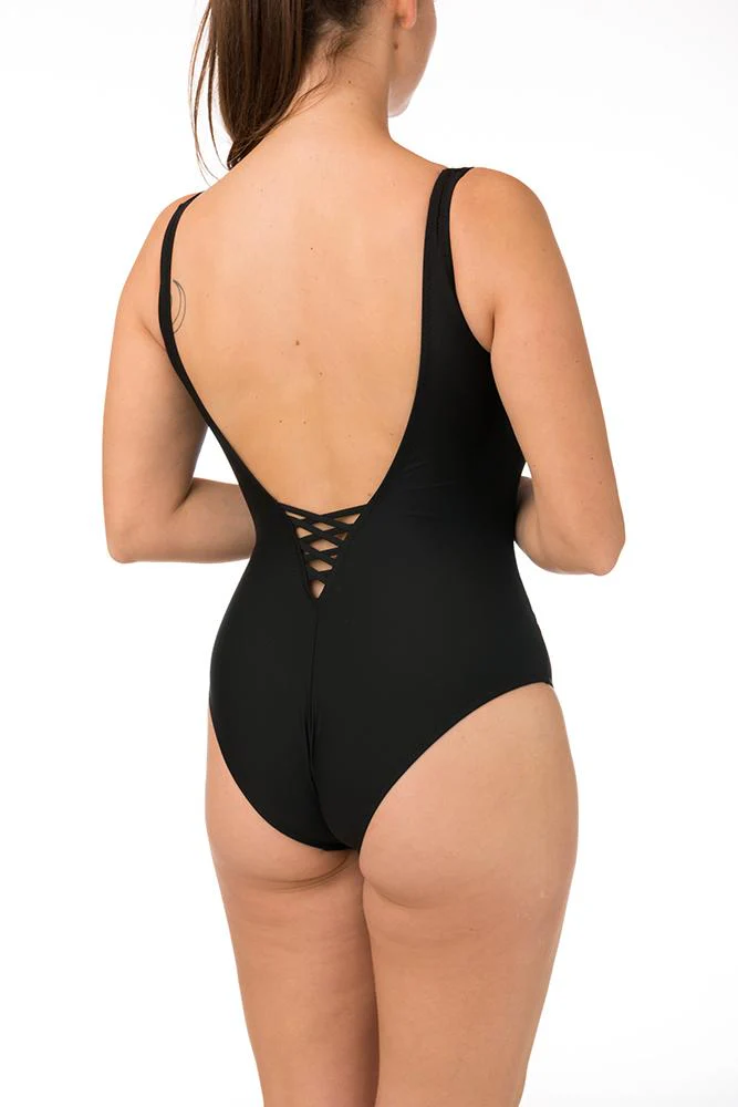 Costume da bagno intero in coppa D con leggera imbottitura fissa impreziosito da decoro frontale intrecciato nello scollo e sulla schiena . Caratterizzato da un’ottima vestibilità, dona leggerezza alla figura e sostiene il decoltè grazie ad elastico interno sottoseno.