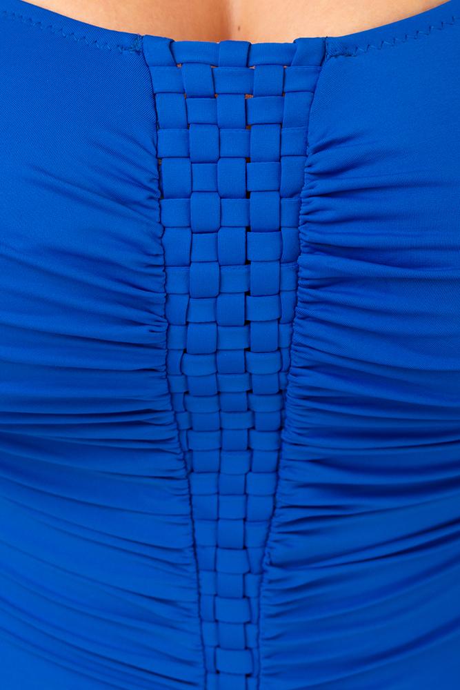 Costume da bagno intero in coppa D leggermente arricciato impreziosito da decoro frontale intrecciato che allungando la figura . Caratterizzato da un’ottima vestibilità, dona leggerezza ma sostiene il decoltè grazie ad elastico e retina interno.