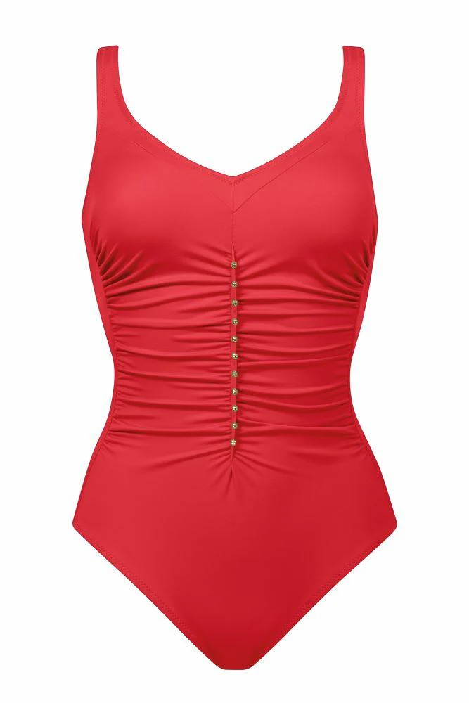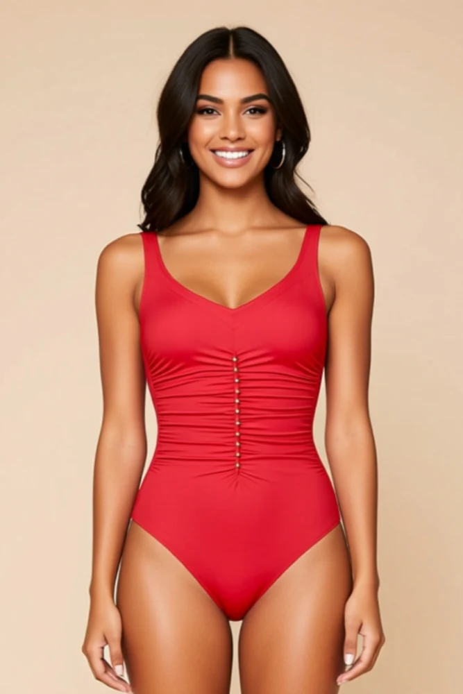 Costume da bagno intero con scollo a cuore realizzato con una lycra che modella leggermente la figura donando un effetto snellente grazie anche ad un leggera arricciatura del tessuto.
