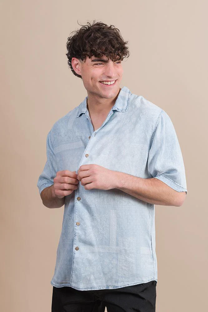 Camicia a maniche corte con bottoni e colletto in fresco tessuto a stampa tribale con bottoni.